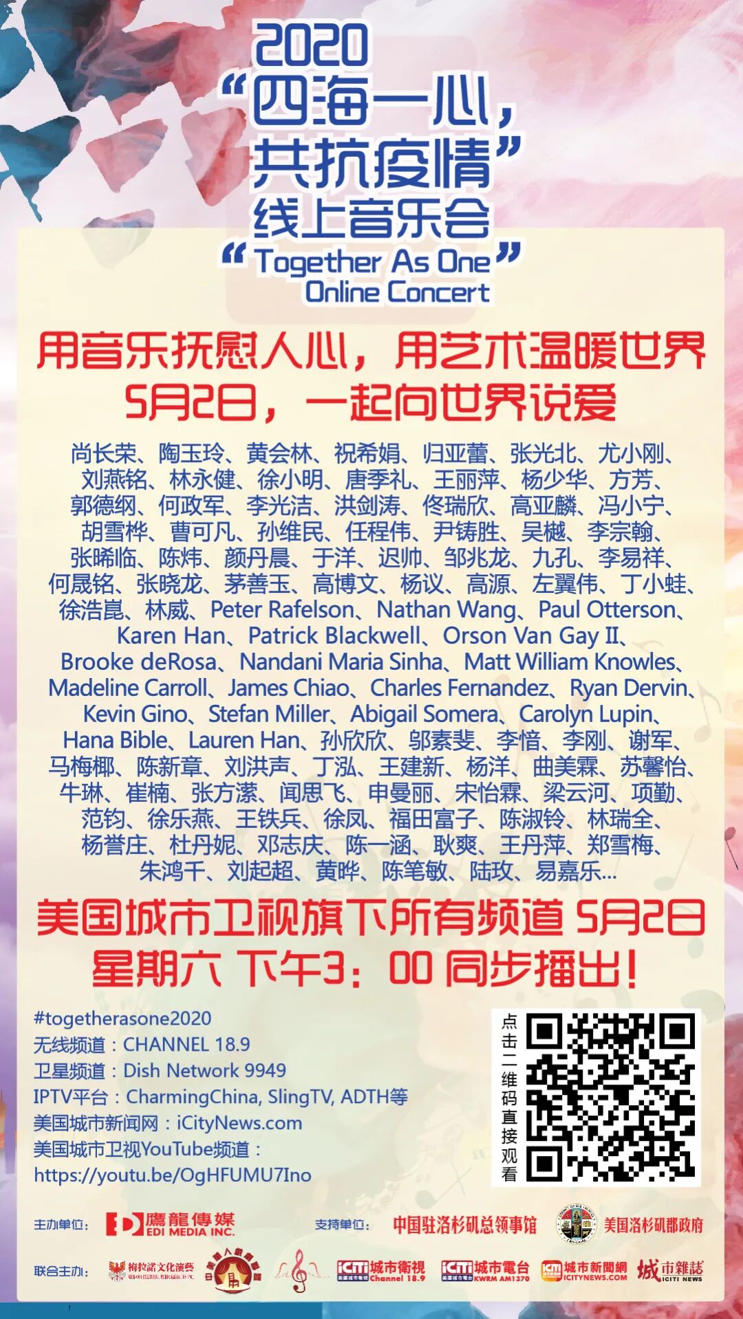 为抚慰人心,感恩每一位前线工作者的无私奉献,美国鹰龙传媒在中国驻洛杉矶总领馆和洛杉矶郡郡政府的共同支持下,联合中美超过100位艺术家和文艺团体推出一场跨越地域和空间,东西方艺术文化交汇的线上音乐会—“四海一心,共抗疫情”, 用艺术的甘泉滋润疫情中心灵的荒漠,用音乐的温暖传递人间真情。