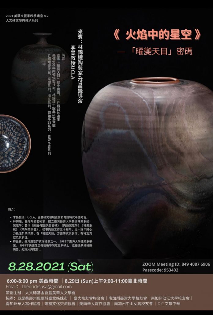 【美洲华联社8月27日洛杉矶讯】2021美华秋季文艺季将于8 月28日(周六)及 9月11日(周六)举办二场「文学与传承」讲座,《火焰中的星空》-曜变天目密码,找回失传800年的南宋极致瓷艺;以及《胡金铨导演和他的电影情怀》- 胡「导」胡「演」。此活动是由美国人文砖基金会暨美华人文学会策划主办及多个美国文化交流、文学等社团协办, 欢迎参加!