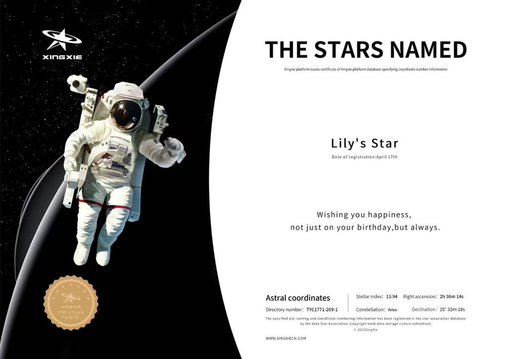 它在 2025年4月17日,被铭刻在星协数据库中,从此在银河中悄悄地闪闪发亮✨愿它替宝贝在遥远的天际守望每一个梦想,