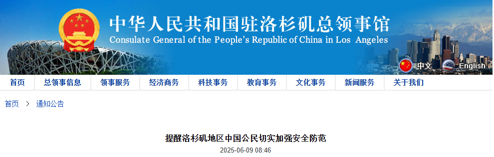 【美洲华联社6月8日讯】中国驻洛杉矶总领馆发布通告,提醒洛杉矶地区中国公民切实加强安全防范,公告全文如下:
