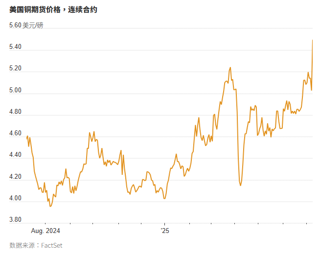 美国铜期货价格周二收于每磅5.6450美元,较一年前上涨23%。与此同时,在全球交易中心伦敦,铜期货价格最近约为每磅4.44美元。