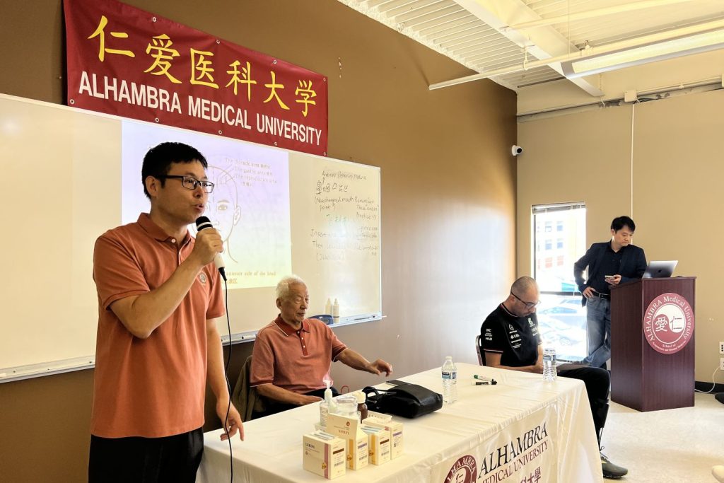 仁爱医科大学校友会会长张国栋博士(左一)主持焦氏头针讲座。黄超博士(右一)播放讲座视频