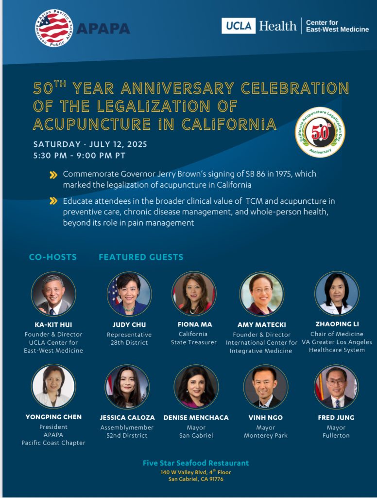 为了庆祝这一历史性的日子,美国亚太裔公共事务联盟南加海岸分会(APAPA-Pacific Coast Chapter/ PCC)联合加州大学洛杉矶分校中西医结合中心(UCLA Center for East-West Medicine/CEWM),与各族裔的针灸公会、针灸学校一道, 在洛杉矶圣盖博市半岛海鲜酒家举办了隆重的庆祝晚会。会上嘉宾云集,喜气洋洋,举杯同祝加州针灸界50周年生日快乐!
