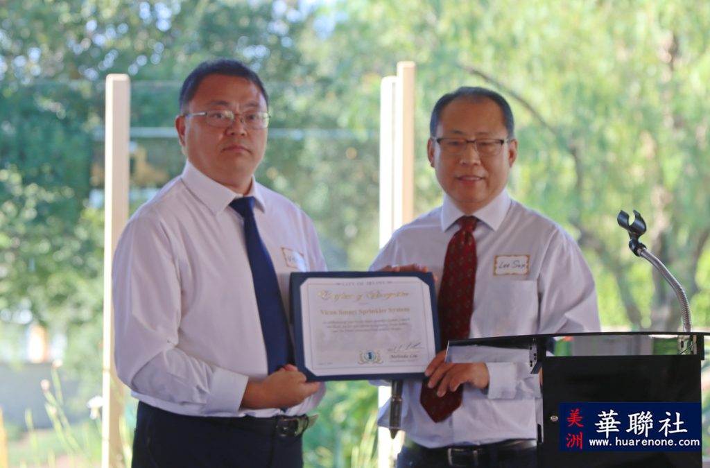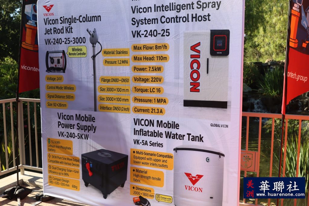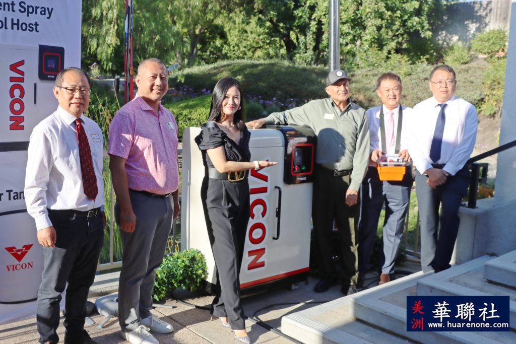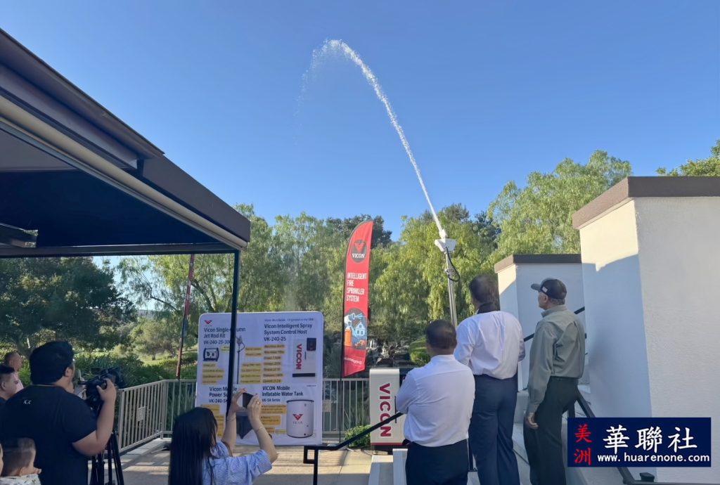 【美洲华联社7月28日洛杉矶报道】美国威肯科技集团(Vicon)于7月27日在尔湾附近的Coto De Caza高尔夫球俱乐部举行主题为“守护您的家园,抵御野火威胁”的新闻发布会,宣布推出全新研发的Vicon智能喷淋系统—VK-240-25-3000。森林湖市議員于淼(Benjamin Yu)、尔湾市财政委员会专员孙立清(Dr.Lee Sun)以及消防部门的代表到场祝贺,并在现场演示了基于“把消防车搬进您的家里”的产品理念所研发的这款新的智能灭火系统。