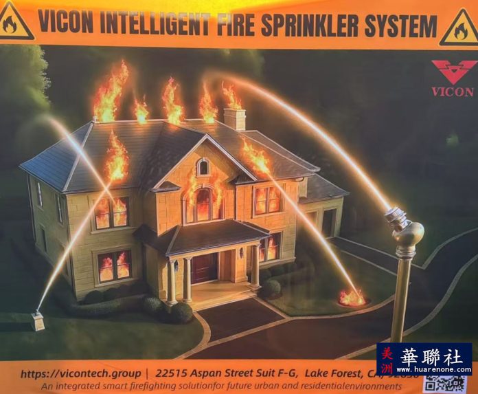 【美洲华联社7月28日洛杉矶报道】美国威肯科技集团(Vicon)于7月27日在尔湾附近的Coto De Caza高尔夫球俱乐部举行主题为“守护您的家园,抵御野火威胁”的新闻发布会,宣布推出全新研发的Vicon智能喷淋系统—VK-240-25-3000。森林湖市議員于淼(Benjamin Yu)、尔湾市财政委员会专员孙立清(Dr.Lee Sun)以及消防部门的代表到场祝贺,并在现场演示了基于“把消防车搬进您的家里”的产品理念所研发的这款新的智能灭火系统。