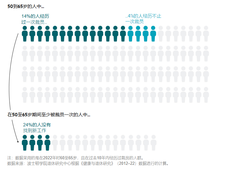 而另一端,年过50岁的劳动力同样步入动荡期。波士顿学院退休研究中心数据显示,50至65岁人群中,有14%在职业生涯后期遭遇过裁员,近四分之一的人再未重返职场。其中重新就业者的薪资普遍下降,男性平均降幅达15%(WSJ,Getting Laid Off Late in Your Career)。