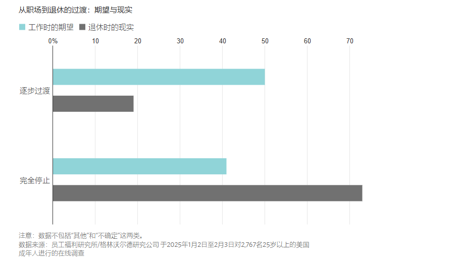 事实上,不少中高龄劳动者的退休方式也呈现出“计划赶不上变化”的落差感。根据皮尤研究中心与格林沃尔德研究公司2025年初对全美2,767位25岁以上成年人进行的调查,大约一半受访者原本期待能够“逐步过渡”到退休状态,比如转为兼职、顾问或阶段性工作,但现实中真正实现这一方式的比例却远低于预期;相反,“完全停止工作”的实际比例远高于人们的预想(见图:从职场到退休的过渡:期望与现实)。