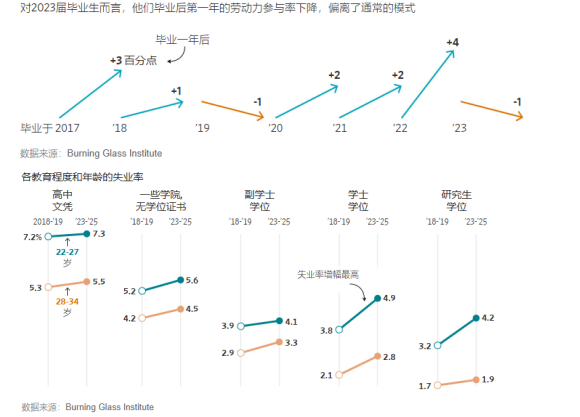 在生成式AI加速渗透职场的当下,美国的年轻人和中高龄劳动力同时面临着前所未有的就业压力。根据《华尔街日报》(WSJ)报道,2024年,应届大学毕业生的失业率已升至6.6%,高于整体失业率,不少公司甚至直接取消了入门岗位或实习生计划。一些企业表示,“AI能更快完成任务,也不需要培训”,这让22岁的毕业生在起点就陷入“被边缘化”的困境(WSJ,AI Disrupts Job Prospects for College Graduates)。