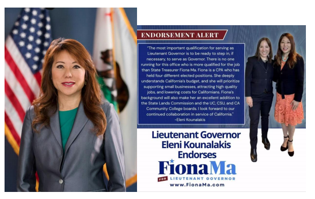【美洲华联社8月12日沙加缅度讯】加州政坛两位重量级女性领导人——现任副州长埃莱尼·库纳拉基斯(Eleni Kounalakis)与州财政部长马世云(Fiona Ma)近日宣布将在2026年全州大选中互相支持对方的竞选。库纳拉基斯将支持马世云角逐加州副州长,而马世云则支持库纳拉基斯出任下一任加州财政部长。