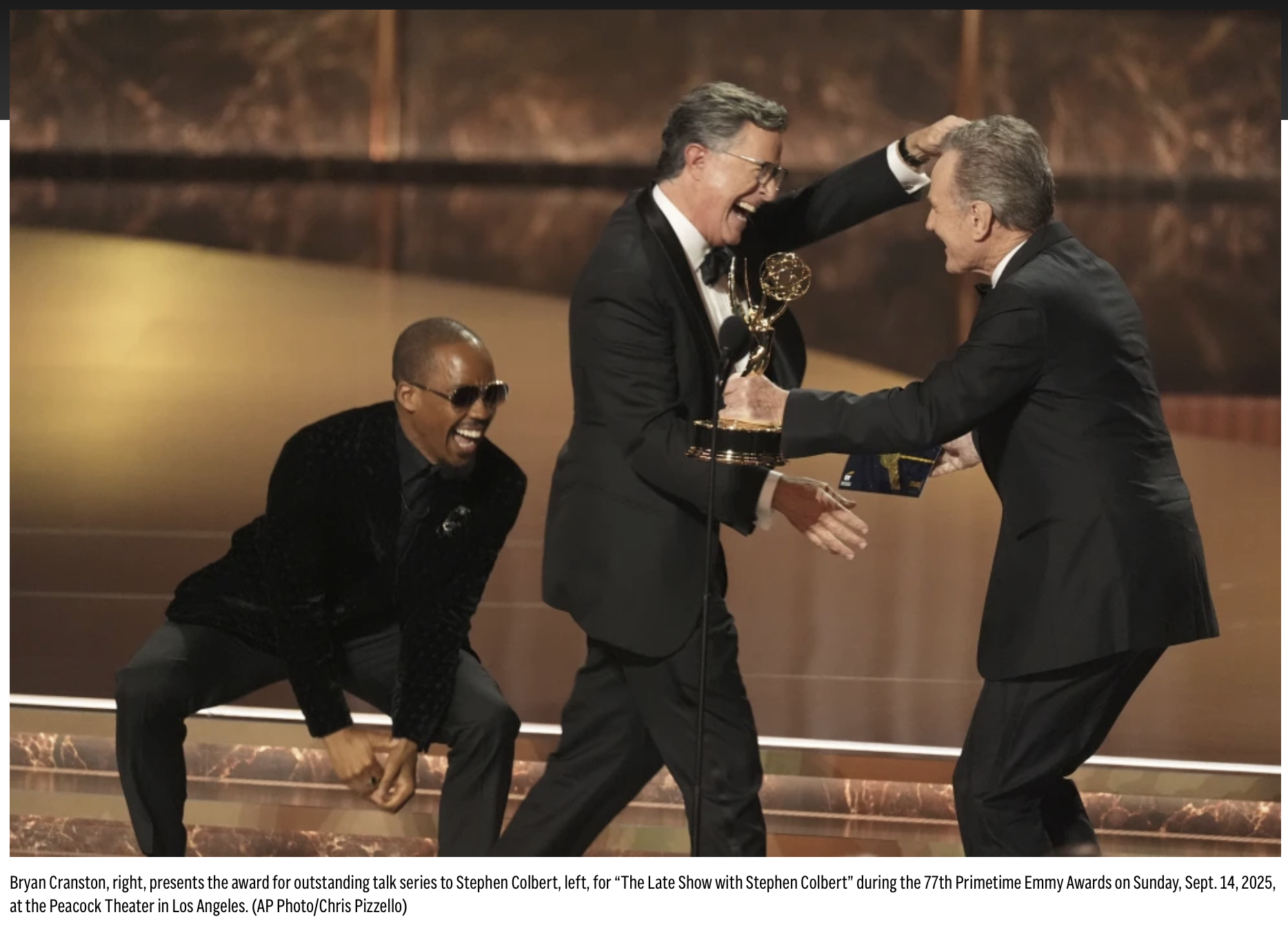 尼尔森公司周一公布的数据显示,CBS第77届黄金时段艾美奖由Nate Bargatze主持,约有742万观众收看了该节目。当晚的大赢家是《演播室(The Studio)》、《青春期(Adolescence)》、《皮特(The Pitt)》和得到了孔雀剧院观众大力支持的主持人Stephen Colbert。