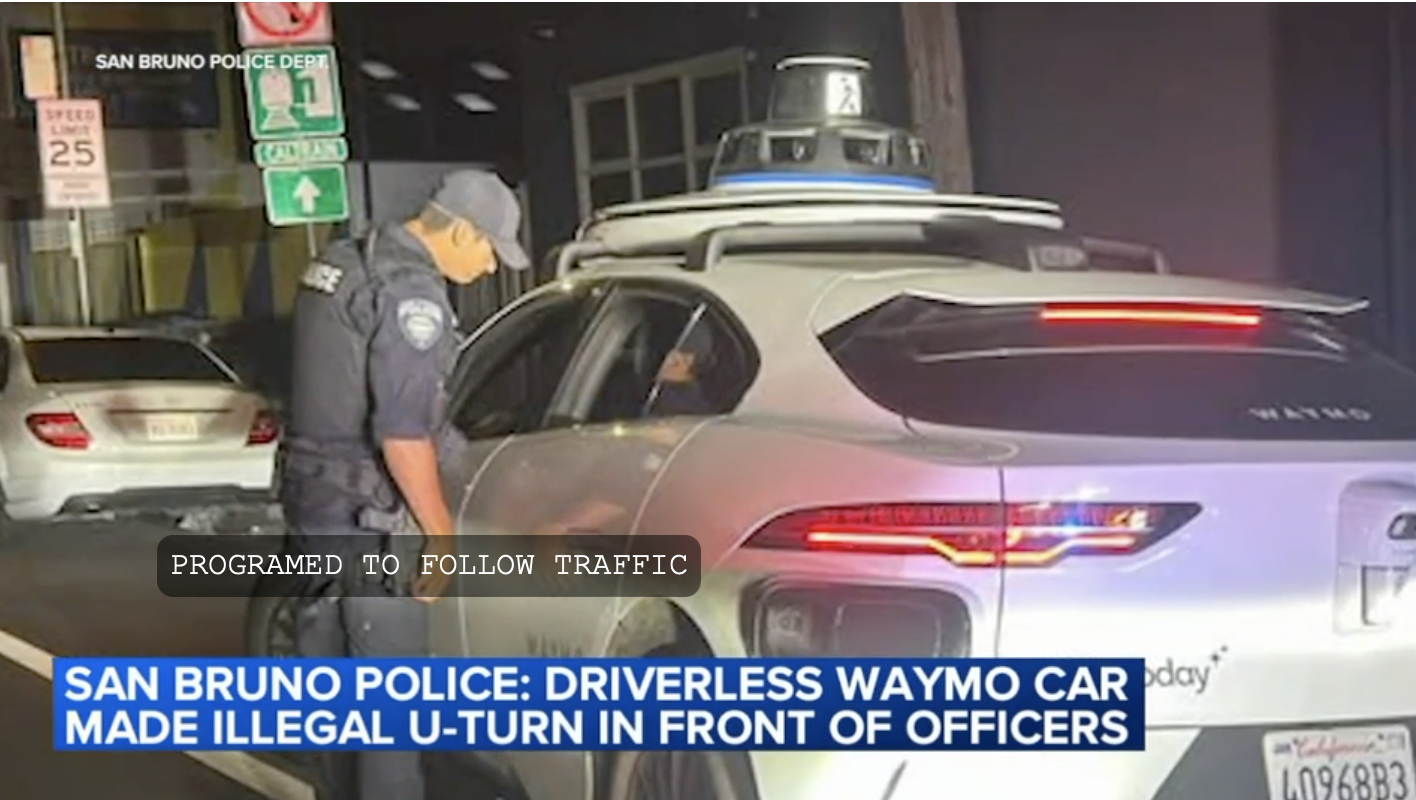 Waymo无人驾驶汽车在北加州因非法掉头被拦下停车 2025年10月1日 FacebookTwitterPinterestWhatsApp 【美洲华联社10月1日加州San Bruno讯】你认为自动驾驶汽车被编程为遵守交通法规吗?再想想。 加州圣San Bruno警方上周五晚上在对酒后驾驶进行打击时,拦下了一辆无人驾驶的Waymo汽车。 警方表示,Waymo在他们面前非法掉头。警方分享了拦截时的照片。 没有发出传票,因为没有司机可以传唤。不过到明年7月,当一项新的加州法律生效时,这种情况将发生变化,该法律允许执法部门向无人驾驶汽车的运营商发出传票。