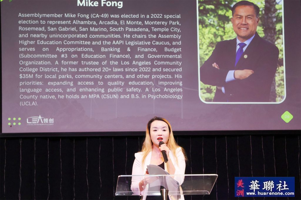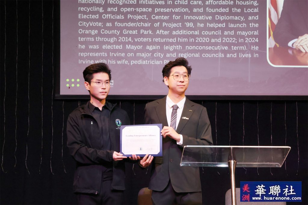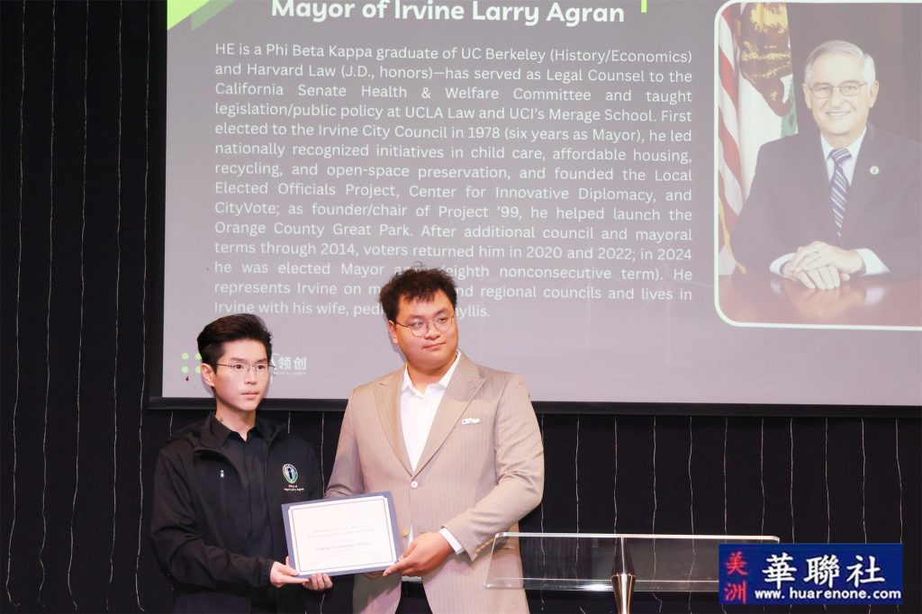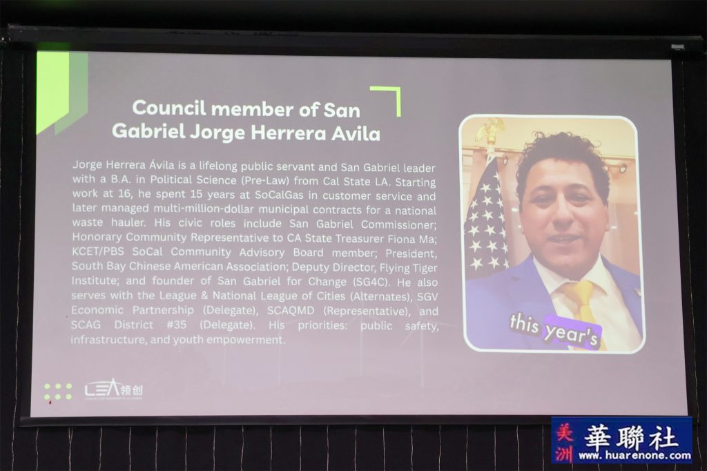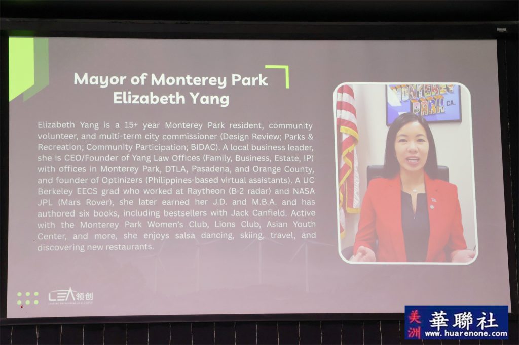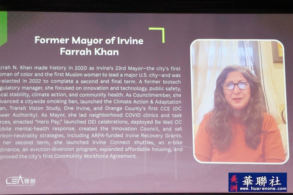 蒙特利公园市市长杨安立(Elizabeth Yang)、圣盖博市市议员Jorge Herrera Avila以及尔湾前任市长Farrah Khan均发来祝贺视频并在现场播放。多元的到场支持、视频致辞与证书嘉奖,体现了地方与联邦层面对气候行动、科技创新与社区合作的持续关注,更体现了本次活动以及主办组织:美国领创商业联盟在本地受到各级政府大力支持及帮助。
