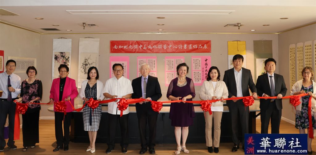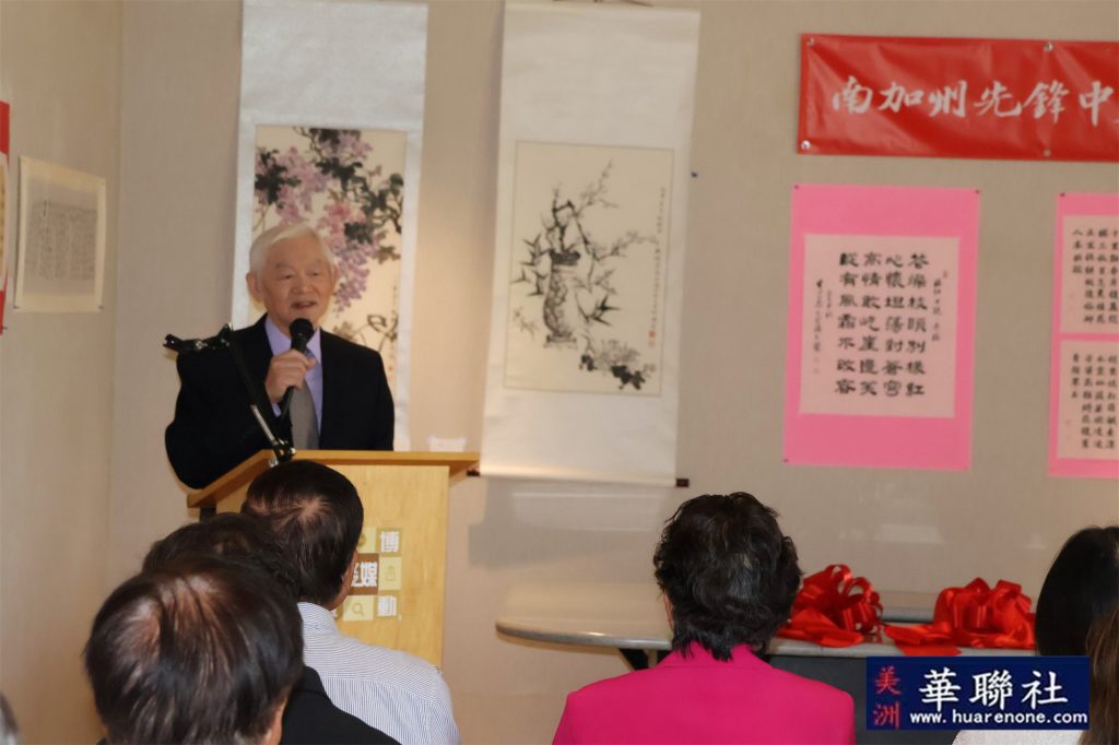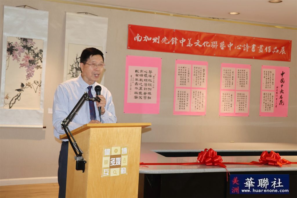 【美洲华联社10月17日埃尔蒙地市报道】南加州先锋中华文化联艺中心在伟博文化中心二楼举办诗书画联展,展会主办人、南加州先锋中华文化联艺中心行政总裁、诗人谢超林、南加州先锋中华文化联艺中心书记、财长、法律顾问谢吴佩芳律师、商界精英刘建国、刘立红、陈慧碧、洛杉矶谢氏公所主席谢少兰、南加州先锋中华文化联艺中心副总裁、书法家甘富忠、美国华社南加联盟主席魏林峰与近百位书法诗绘画爱好者出席诗书画联展剪彩揭幕典礼。知名主持人陈述主持活动。