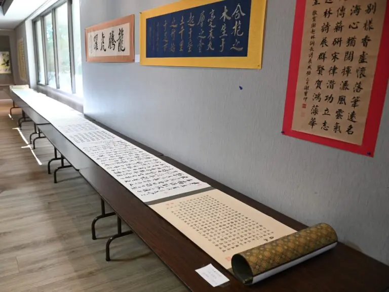 南加州先锋中华文化联艺中心诗书画作品展展出诗人、画家、书法家谢超林、谢宝仲、谢寿南、梅红、甘富忠、苏韶肇、孙惠莉、梁启智、陈祖卫、罗树强、欧碧娴、朱龙、黄娴静十三位艺术家的50多件作品。其中,著名书法家甘富忠的一件33英尺书法长卷非常引人注目:这幅书法长卷用6种不同字体书写12首历代经典诗词,作品精彩纷呈,精彩绝伦。
