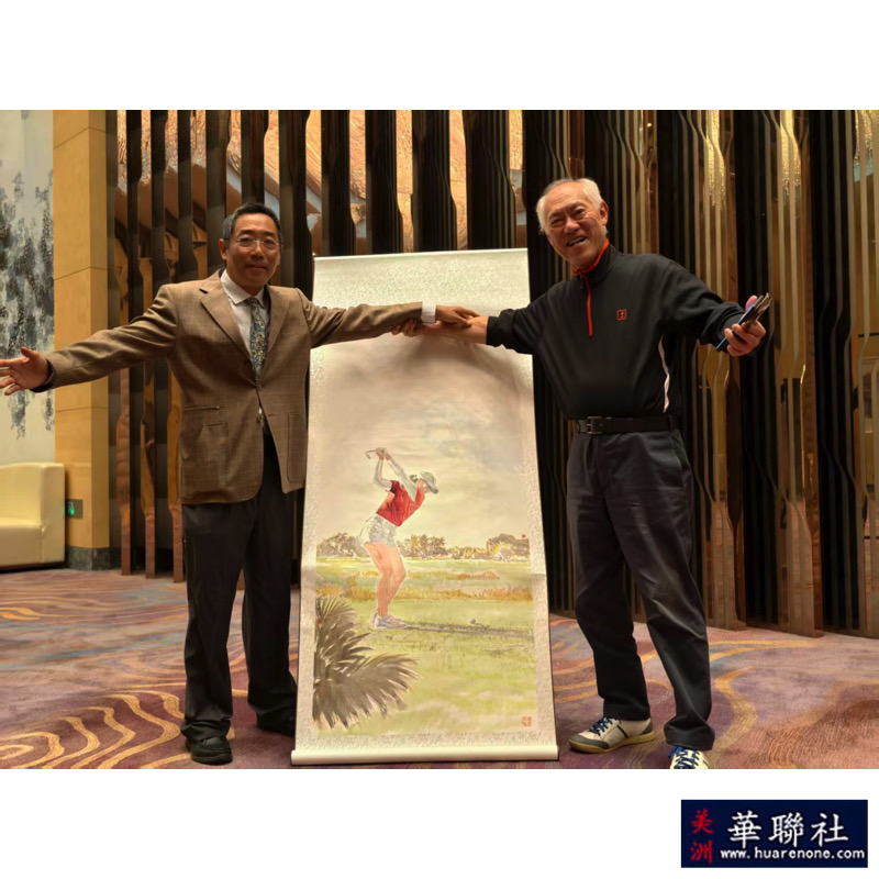 在欢迎晚宴现场,加拿大代表团团David 林和顾小崙将一副弘一法师画展的复制品赠送给江启光,感谢他在全球华人世界积极推动高尔夫球运动的努力。