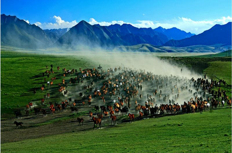 民乐到西宁途径有2000多年历史的山丹军马场。“胡马!胡马!远放焉支山下,跑沙跑雪独嘶,东望西望路迷。迷路!迷路!边草无穷日暮。” 唐代诗人韦应物的一曲《调笑令》,描绘了一幅雄伟壮丽的图景:成群的骏马放牧于焉支山下的大草原上,绵延的群山、无边的草原、奔腾的骏马,气势壮观,境界阔大。这便是山丹马场,地处祁连山冷龙岭北麓的大马营草滩(史称汉阳大草滩)。这里地域广阔,土壤肥沃,水源充足,牧草丰盛,是天然的驻牧场所。
