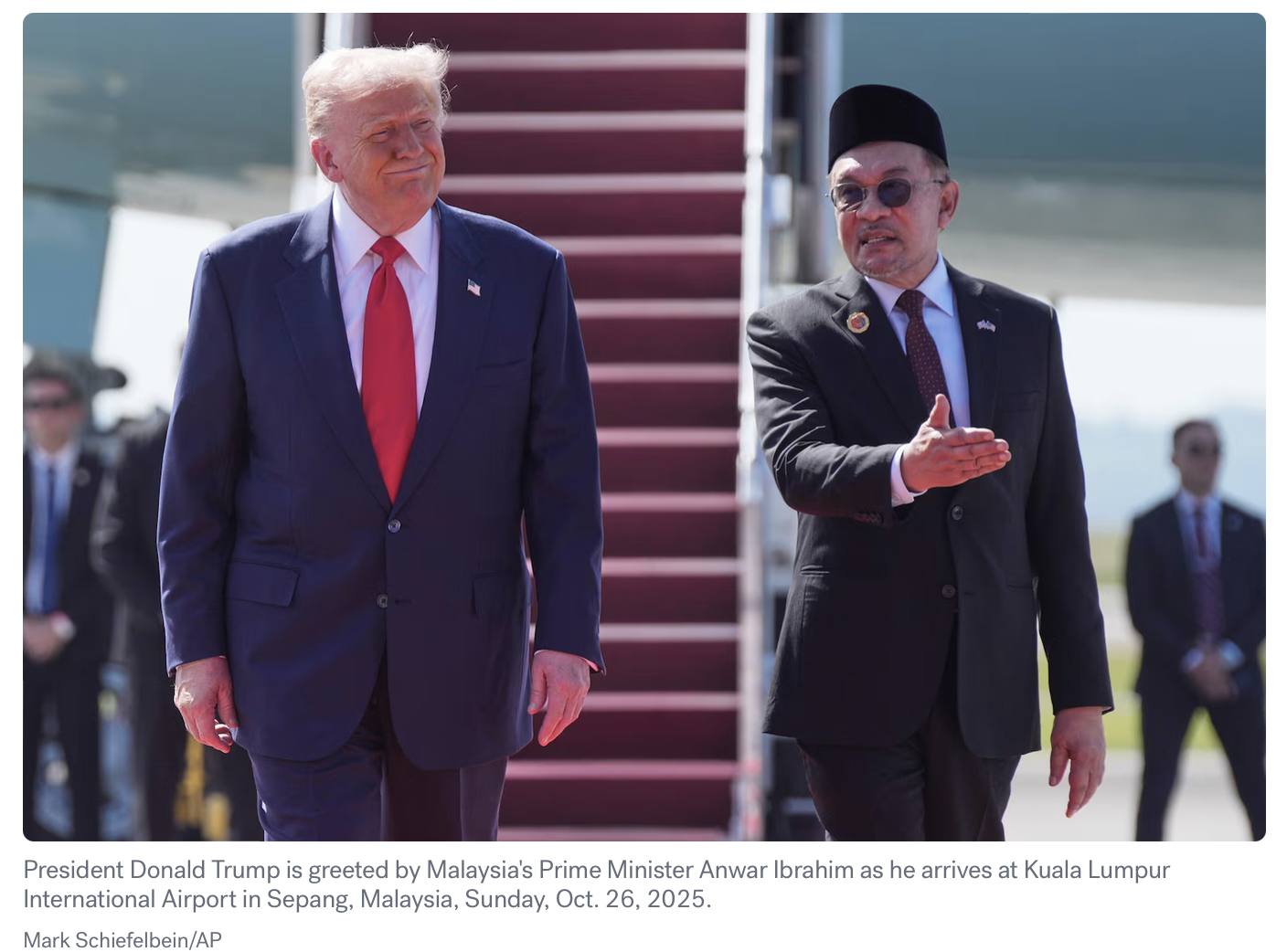 特朗普在吉隆坡期间还与柬埔寨和马来西亚签署了贸易协议,与泰国签署了贸易协定框架,与马来西亚签署了矿产协议。