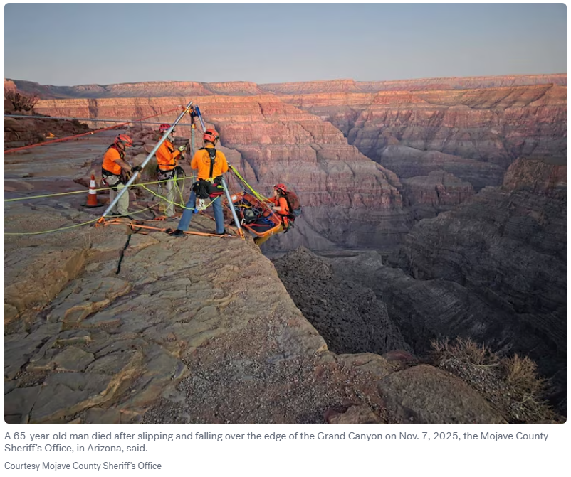 【美洲华联社11月8日讯】亚利桑那州警方称,一名65岁男子滑落大峡谷边缘,坠落超过100英尺(约30米)后身亡。