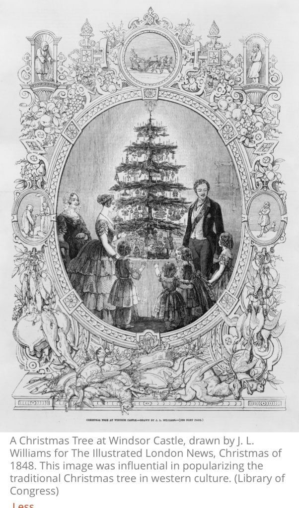 圣诞树的传统在1848年获得了国际吸引力,当时伦敦新闻的插图中展示了受欢迎的王室夫妇,德国出生的阿尔伯特王子和维多利亚女王,他们的孩子站在装饰好的圣诞树周围。 下面这张图片帮助西方文化普及了传统,到19世纪中叶,在东部城市的许多美国家庭中发现了这种树。