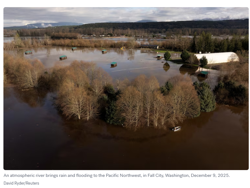 一场持续袭击太平洋西北地区的“大气河流”现象目前集中在华盛顿州西部,那里“历史性”的洪水可能迫使10万人撤离。