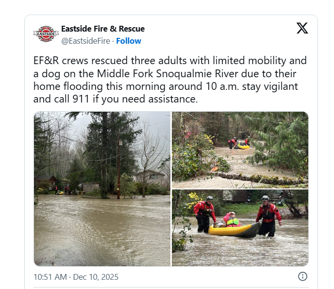 官员在X上表示,由于房屋被淹,3名行动不便的成年人和一条狗在斯诺夸尔米河中游获救;90号州际公路东行方向发生山体滑坡,导致车道被堵塞。 预计该地区大多数河流将达到中度或重度洪水水位。