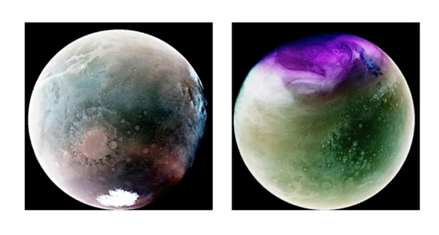 这组紫外光谱图像显示了2022年火星的大气特征(左图),以及2023年火星经过其轨道上距离太阳最远点后,由“MAVEN”探测器拍摄的火星北半球图像。