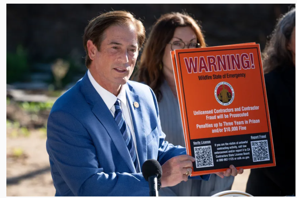 洛杉矶县地方检察官办公室指控这些男子在自然灾害期间明知故犯地从事无证承包工作,这在加州属于重罪。