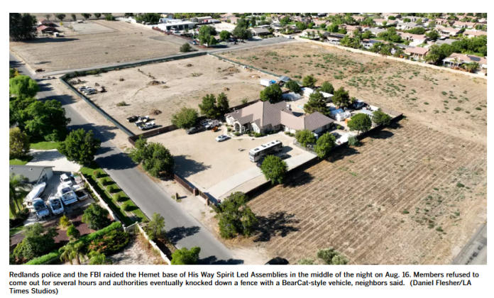 雷德兰兹警察局发言人卡尔·贝克称,8月12日,警方在河滨县安扎镇一处与该组织有关的偏远大院进行了类似的突袭,短暂拘留了8人,并查获了电子设备和其他数字证据。