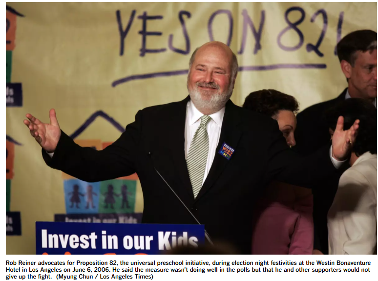 10号提案被认为是具有里程碑意义的政策。雷纳为此争取到了史蒂文·斯皮尔伯格、罗宾·威廉姆斯以及他自己的父亲——喜剧传奇人物卡尔·雷纳的帮助。雷纳曾于 1971 年至 1981 年与情景喜剧《拉弗恩与雪莉》的女主角佩妮·马歇尔结婚。他在电影《当哈利遇到莎莉》的片场结识了摄影师米歇尔·辛格,两人于 1989 年(电影上映同年)结婚。