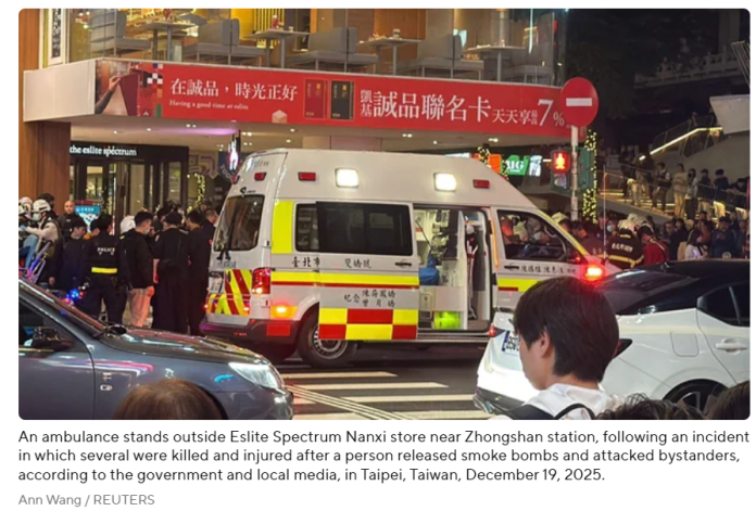 【美洲华联社12月19日综合报道】据台湾中央社和台北市政府消息,当地时间周五晚间,一名男子在台北持刀并投掷烟雾弹,无差别袭击人群,造成至少3人死亡、9人受伤。嫌犯随后从一家百货公司坠楼身亡。