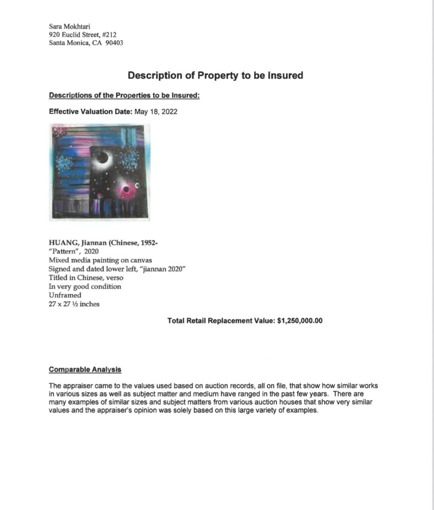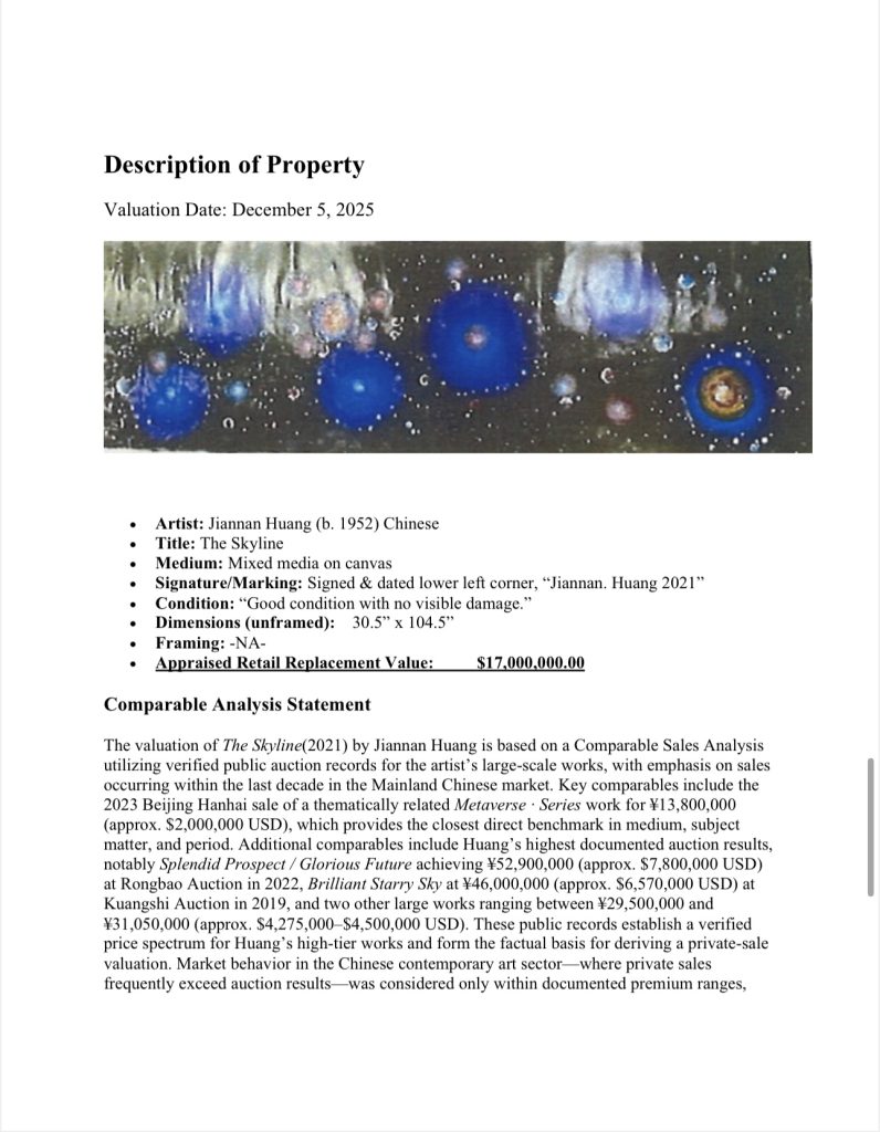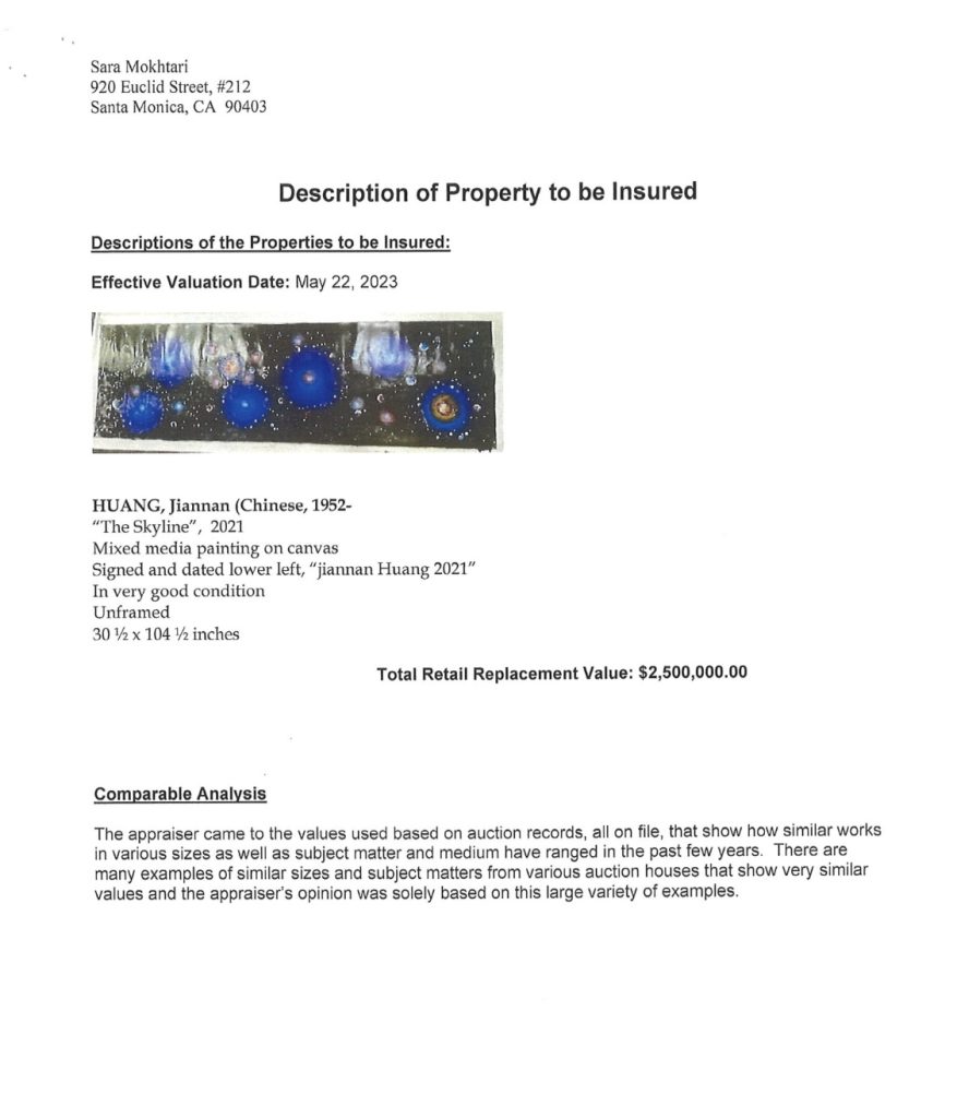 其实,早在2022年5月比佛利山庄最权威的估计机构—萨拉·莫赫塔里就将中国艺术家黄建南3幅油画评估出了504万美金的估价,折算成人民币为3216.63万元。