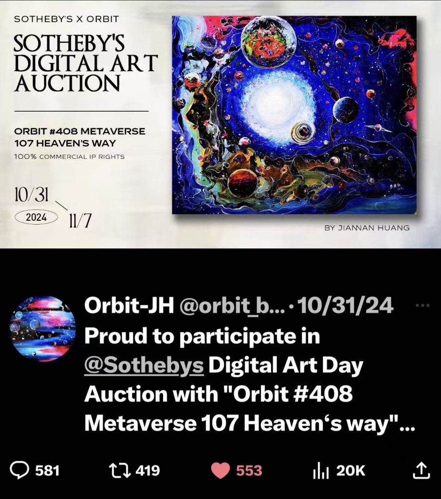 今年11月初,中国的黄建南与美国丽莎.舒尔茨的跨界合作霓虹雕塑作品《金谷银流》(”GOLDEN VALLEY SILVER FLOWING”)估价刚刚进入千万美元俱乐部时,当他们各自的粉丝在不同的场合正在欢欣鼓舞时候,殊不知,仅仅过去一个月,黄建南的另外两幅油画《天际》和《元宇宙》被西好莱坞权威估价机构—”曼努埃尔·托德·威廉姆森MTW”的估价冲破3千2百万美元大关,这是黄建南先生既2024年法国拿破仑干邑获得全球龙年版设计后,又在国际艺术市场建立了一个新的里程碑。