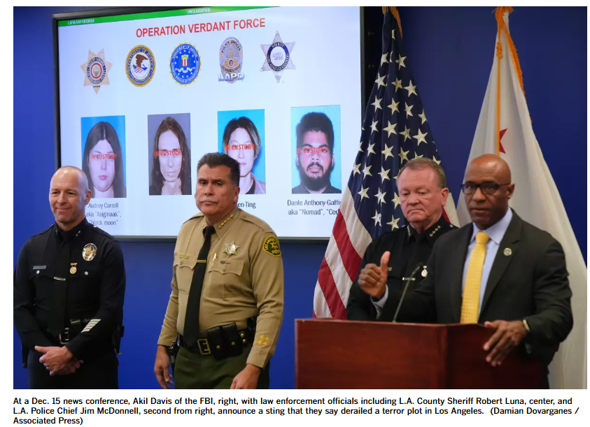由于涉及出于政治动机的暴力行为,这起炸弹阴谋案立即引起了全国关注。联邦调查局称,这个“暴力、本土、反政府组织”计划炸毁南加州的几家企业。如果属实且计划成功,后果不堪设想,无疑会在新年伊始给当地居民和整个地区带来巨大的冲击。