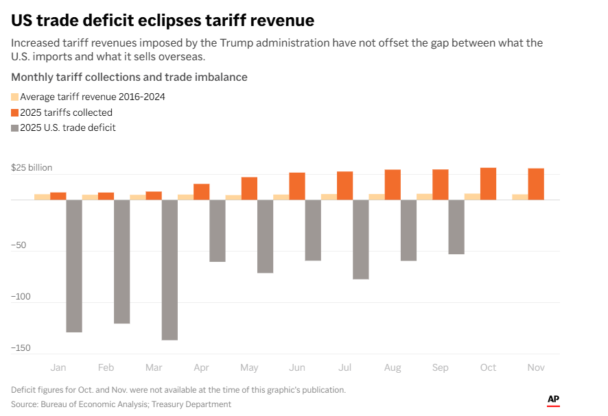 特朗普提高关税确实增加了收入。截至11月,今年已征收超过2360亿美元的关税——远高于往年。但这些收入仍然只占联邦政府总收入的一小部分。而且,这些收入远不足以支持总统声称关税收入可以取代联邦所得税——或者足以让美国人获得意外的股息分红。