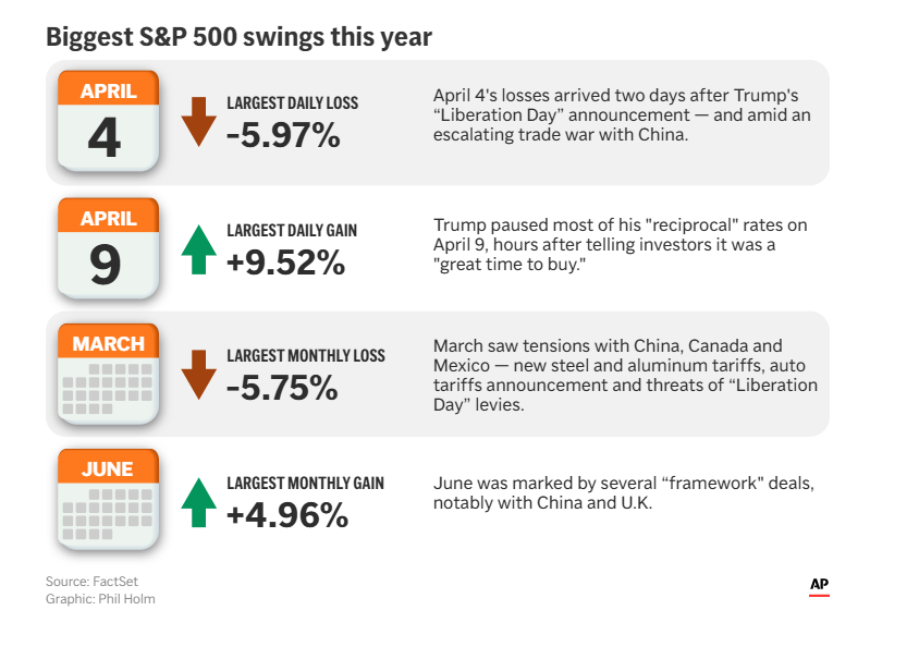 对于投资者而言,今年股市最动荡的时刻恰逢特朗普关税政策最动荡的时期。标准普尔 500 指数是美国最大上市公司的指数,该指数在 4 月份经历了最大的日波动和周波动——并在 3 月份和 6 月份分别录得最大的月度亏损和收益。