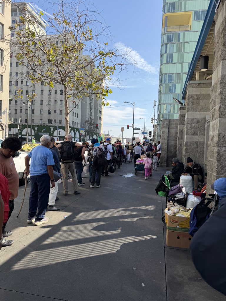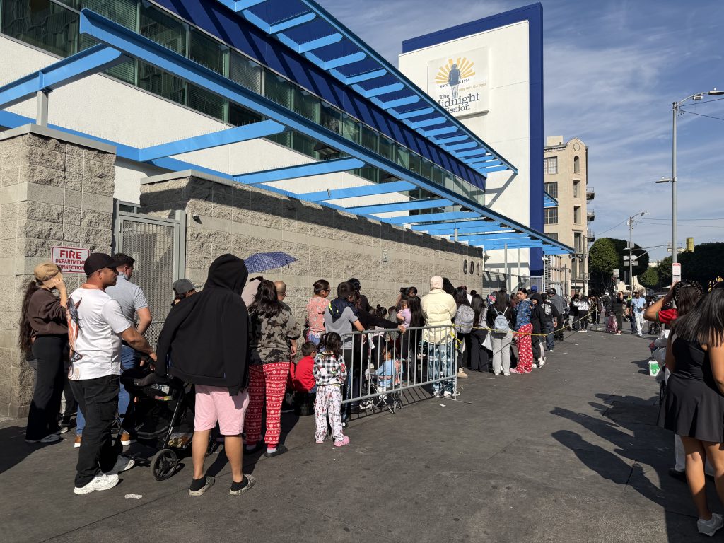 当天在Midnight Mission门口等候领取免费午餐的民众