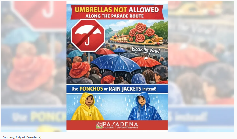 【美洲华联社12月30日帕莎迪纳市报道】您是否计划亲临现场观看第137届玫瑰花车游行的花车、乐队和花卉盛况?鉴于预计会有降雨,帕萨迪纳市政府提醒数十万计划在元旦当天聚集在科罗拉多大道沿线的当地居民和游客,长达5.5英里的游行路线沿途禁止撑伞。