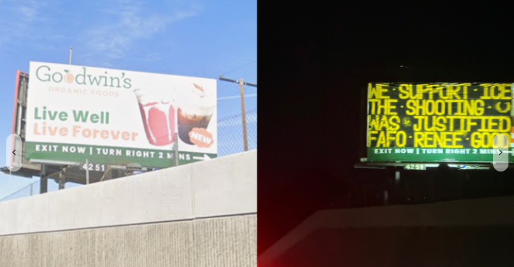 【美洲华联社1月12日洛杉矶讯】南加州一条高速公路旁的广告牌被篡改,出现了支持ICE(美国移民及海关执法局)的信息,以及一条关于联邦官员枪杀Renee Good的令人不安的言论。