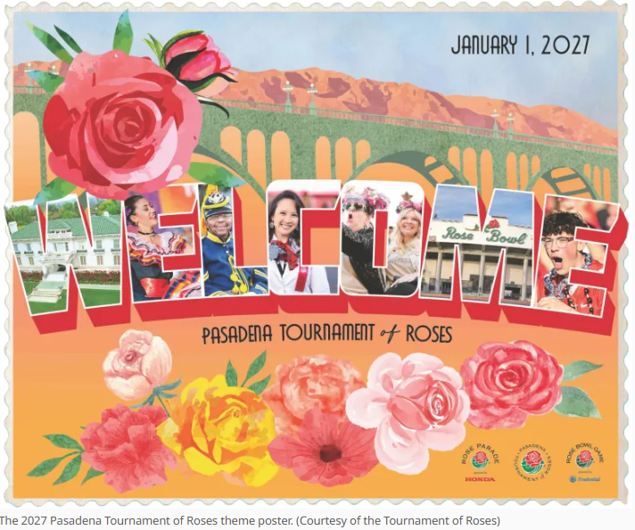 除了选择主题外,马迪根还参与了2027年玫瑰花车游行海报的设计。这张设计成明信片样式的海报拼出了“欢迎”一词,每个字母都配有一张照片,分别代表玫瑰花车游行的方方面面,包括历史悠久的总部、乐队、马术表演、观众,以及位于中心位置的志愿者照片。
