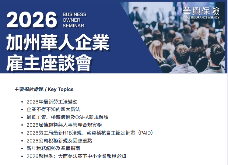 更多資訊請報名華興保險講座:講座日期為1/22安大略、1/29柔似蜜、2/5聖安娜、2/12鑽石吧,下午1點半到5點,多場次、多地點,方便各地雇主靈活選擇。2026年聯邦+加州勞工法海報也開放現場免費索取。聯絡華興保險 (626) 333-1111或登錄https://www.kcal.net/2026-ca-business-seminar/瞭解更多。
