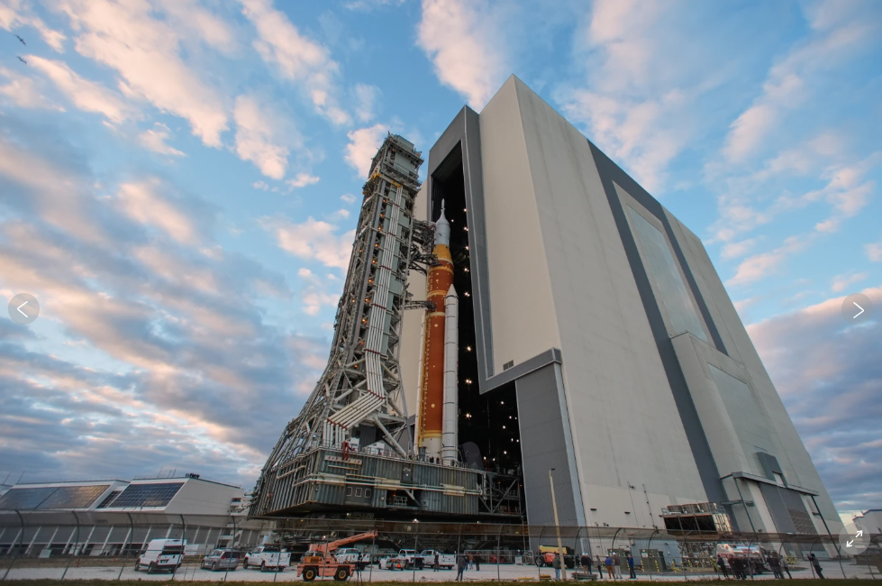 据美联社报道吗,这枚322英尺(98米)高的火箭于黎明时分从肯尼迪航天中心的车辆组装大楼开始以1英里/小时(1.6公里/小时)的速度缓缓驶出。这段四英里(六公里)的跋涉可能要持续到夜幕降临。