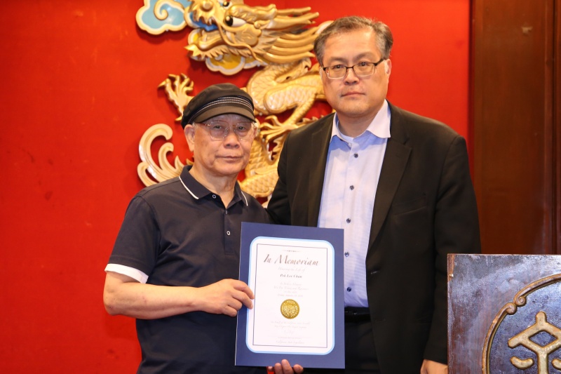 加州49區眾議員方樹強從沙加緬度乘飛機抵達洛杉磯後即赴金龍酒家,向陳燦培送上慰問唁文,讚揚陳李碧清生前默默支持丈夫陳燦培,為美中兩國文化交流作出重大貢獻。陳燦培在餐會上,將帛金分別捐給羅省美以美衛理公會、美國飛虎隊研究院及南加州台山聯誼會作慈善用途,表達回饋社區的心意。