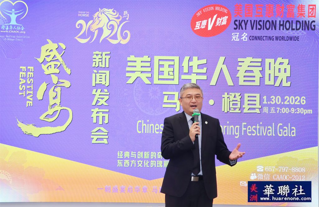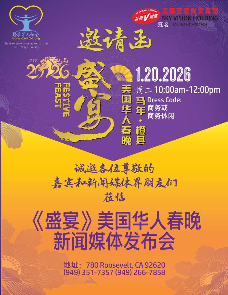【美洲华联社尔湾报道】由橙县华人协会(CAAOC) 主办的 2026《盛宴》橙县华人马年春晚新闻发布会,于1月20日在冠名企业美国互惠财富集团位于尔湾的总部大楼成功召开。在马年春晚正式登台之前,《盛宴》的故事,已悄然写下了第一行。