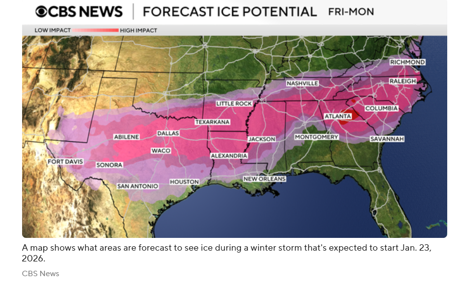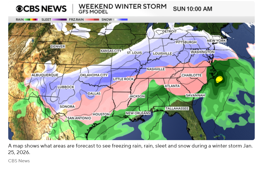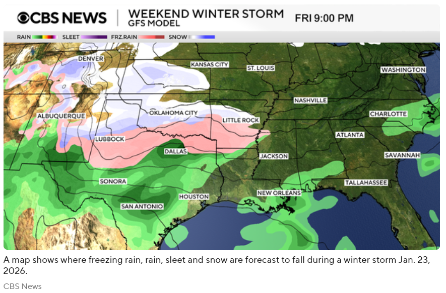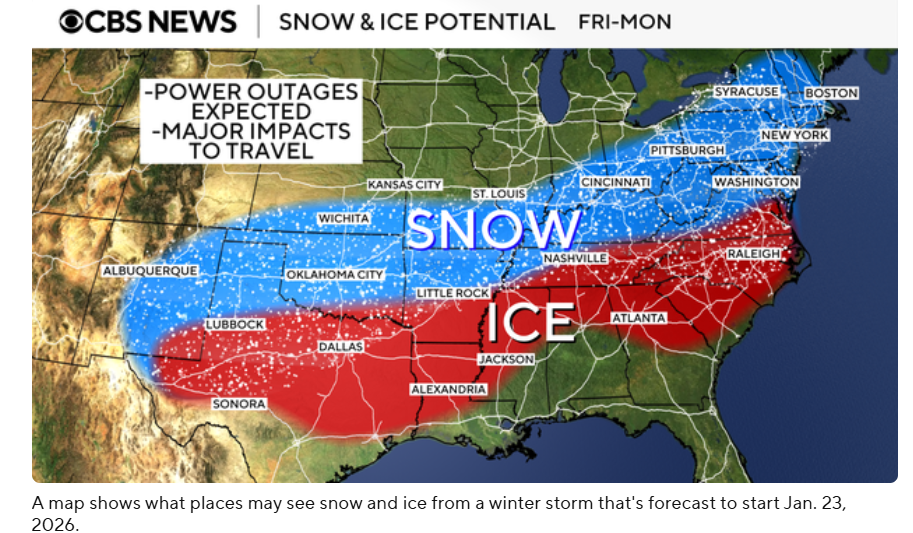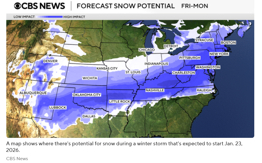 【美洲华联社1月21日讯】据CBS新闻报道,一场强烈的冬季风暴将于周五在美国南部平原地区形成,并在接下来的周末横扫南部地区,进入东海岸。预计这场风暴将带来暴雪、厚冰和严寒天气,对近30个州构成潜在的生命威胁。