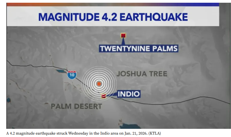 据美国地质调查局称,周三凌晨12:30发生的4.2级地震震中位于印第奥东北约12英里处,震源深度约2.5英里。