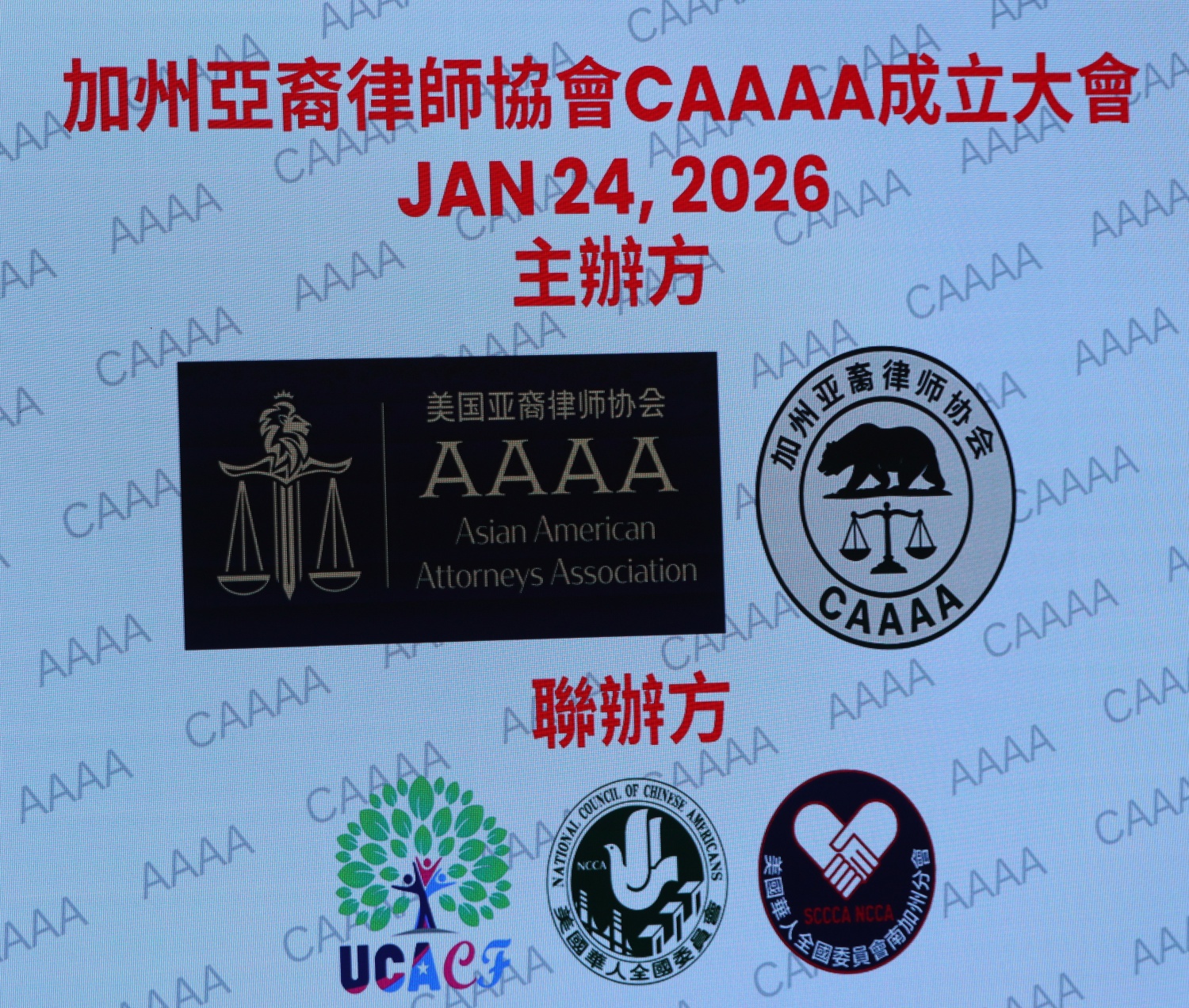 【美洲华联社1月25日洛杉矶报道】美国加州亚裔律师协会(California Asian American Attorneys Association, CAAAA)于1月24日在尔湾市隆重举行成立仪式,华裔社区知名律师华强为创会会长。美国国会议员赵美心等民选官员以及南加州律師界、侨界、商界等知名人士齐聚一堂, 百人共同见证了这一历史时刻。赵美心强调协会对于维护亚裔社区的权益非常重要,并高度评价创会会长华强以及创会会员、蒙特利公园市市长杨安立律师和亚凯迪亚市市议员郑博仁律师等对社区的贡献。