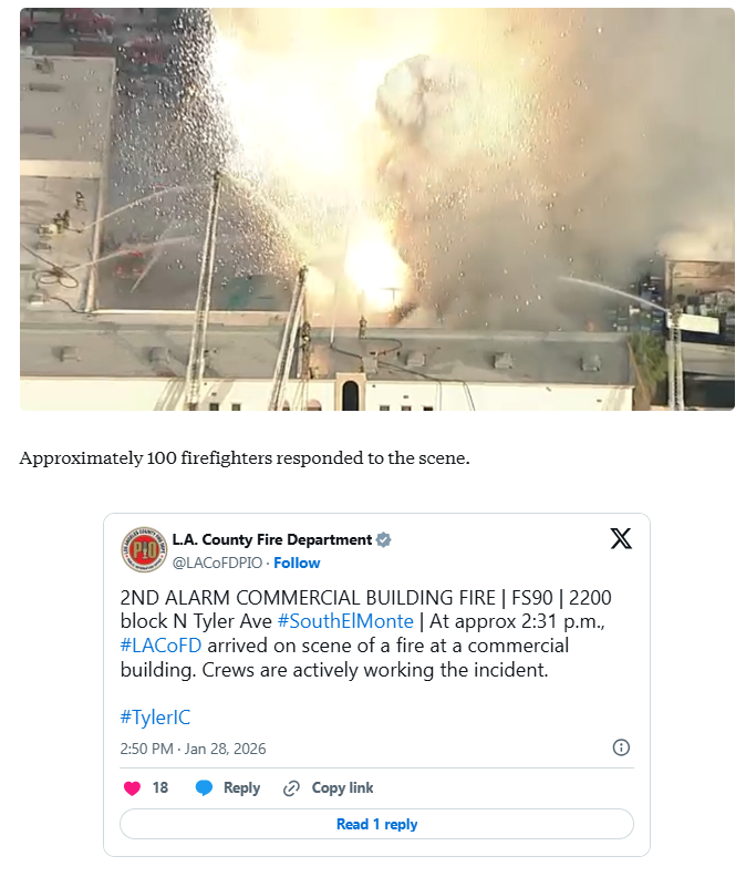 【美洲华联社1月28日南艾尔蒙地市讯】周三,南艾尔蒙地一栋商业建筑发生大火,浓烟滚滚,数英里外的圣盖博谷都能看到。