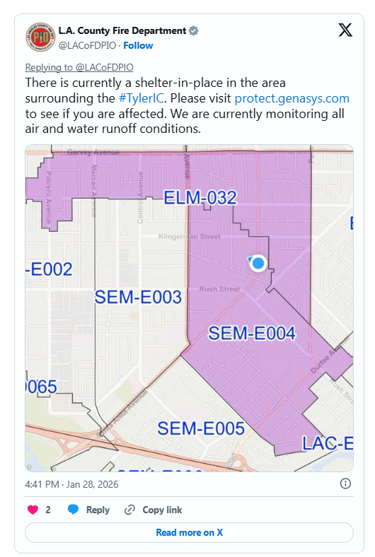 附近居民和工作人员已被要求就地避险,工作人员正在监测空气和水径流情况。