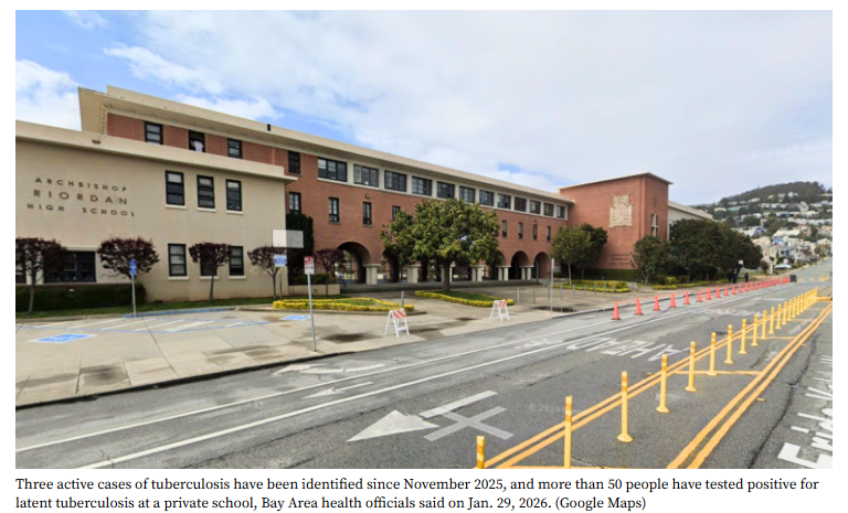 KTLA的姊妹台KRON报道称,截至上周,该校已确诊3例结核病病例。这种主要影响肺部的空气传播细菌感染,首例病例于去年11月在旧金山里奥丹主教高中(Archbishop Riordan High School)报告。