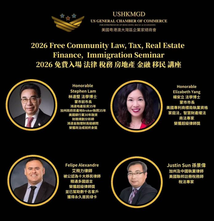 【美洲华联社2月4日洛杉矶报道】美国粤港澳大湾区企业家总商会于2月1日在蒙特利公园市(蒙市)举办免费讲座,蒙市前市长/美国粤港澳大湾区企业家总商会创会主席林达坚法学博士、蒙市市长杨安立律师、艾飞力(Felipe Alexandre)律師和孙景伟律师/税务师分别就法律、税务、房地产、金融、移民等话题进行了精彩演讲。100多位社区各界人士聆听了讲座,国会议员赵美心、加州众议员方树强和前加州众议员伍国庆等到场祝贺。